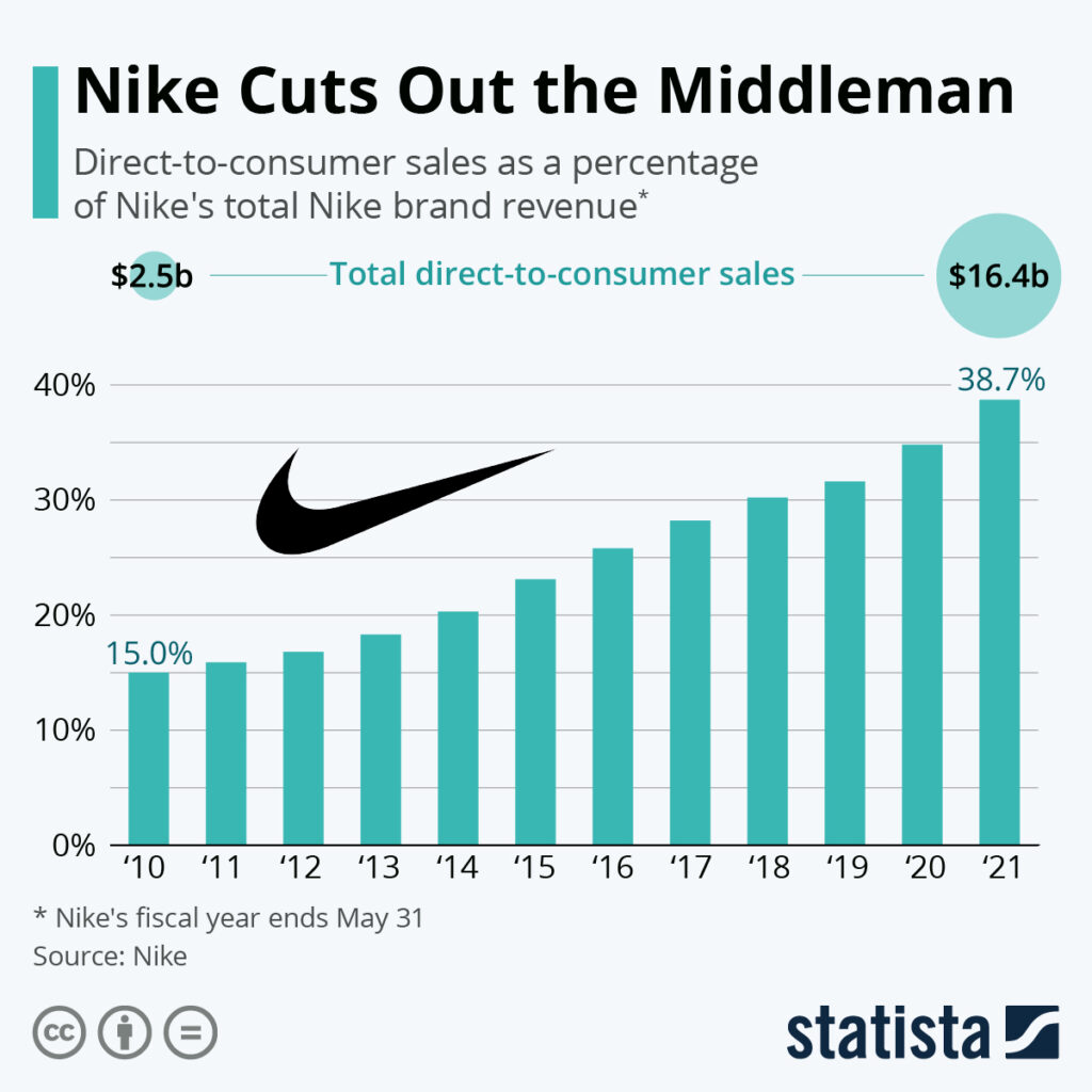 Its direct to consumer model (Nike Direct) was successful, bringing in nearly 39% of Nike's global sales in 2021.